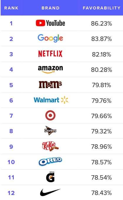 Brands that fall under the umbrella of the food & beverage industry make up half of Gen Z’s top 40. M&M’s ranks highest, coming in at No. 5 with 80% favorability.