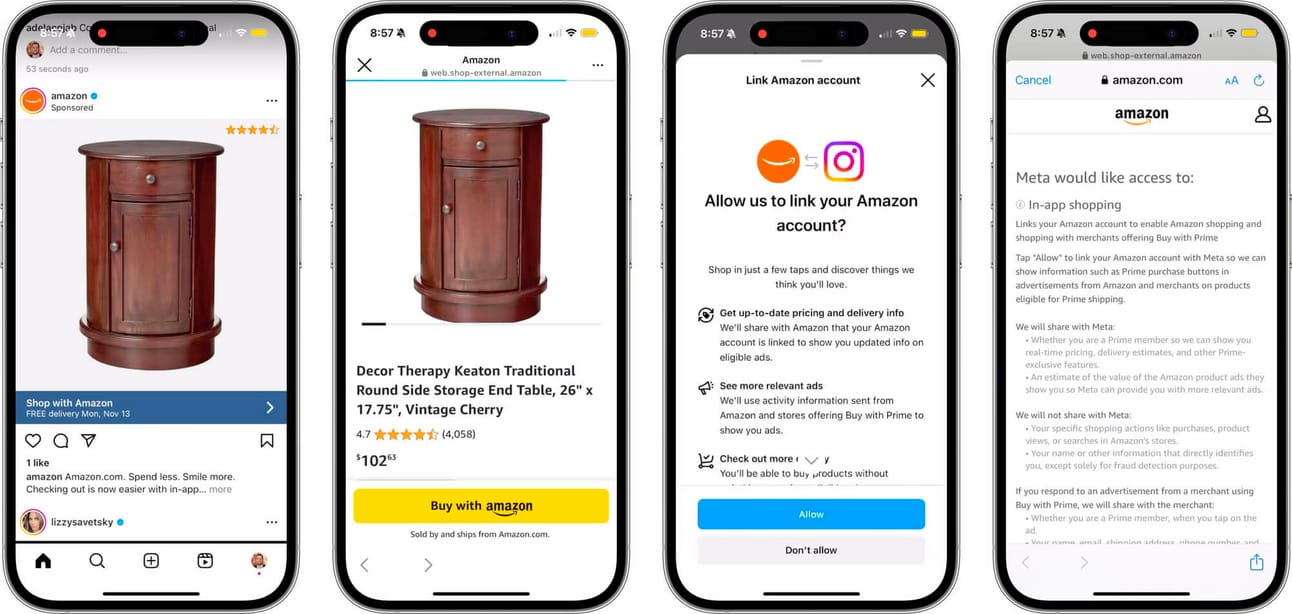 Although it hasn’t been formally announced (as of writing), Amazon and Meta have entered apartnership which links Facebook and Instagram accounts to Amazon and allows on-platform commerce.