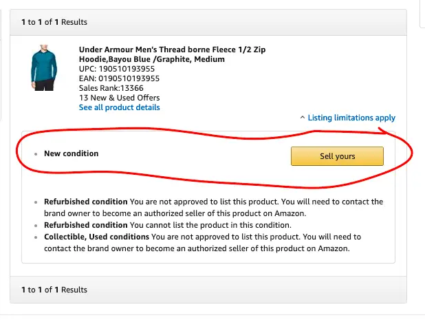 You can usually check to see if a product is restricted or not by logging into your Amazon seller central account and entering the product ASIN. On the seller central website, navigate to Inventory > Manage Inventory > Add a Product and then type or paste the ASIN. You will see a blue link that says “Listing Limitations May Apply” if there are possible restrictions. If you can sell the product, it will show you which conditions you can sell it in (new, used, refurbished, etc) and there will be a big yellow button that says “Sell Yours.”