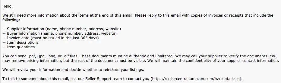 DISCLAIMER: Amazon is an ever-evolving marketplace and deals with policy compliance violations on a case to case basis. The following information is only an array of examples we have used in the past for our personal businesses. The information and templates are not guaranteed to work for your account or product reinstatements, and you should always consult with a lawyer or expert in account restoration.  Amazon takes suspensions very seriously, so we highly recommend doing your research on what information they need from you before replying.